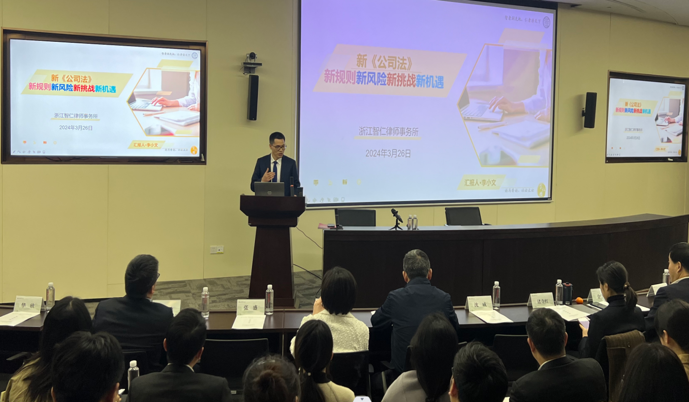 2024年3月26日下午,浙江智仁律师事务所创始合伙人、监事长李小文律师,受邀作为主讲人,为浙江省金融业发展促会会员单位、会员下属企业及钱江世纪城辖区企业的法务人员100余人,就新修订的《公司法》深入解读。这也是他从业20多年来,无数专业讲座的其中之一。