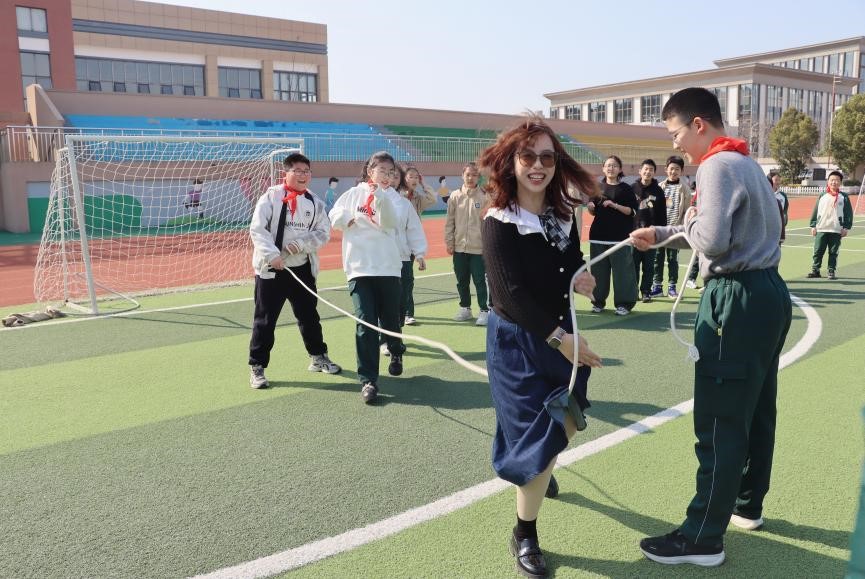 “我们发现,当老师从‘监督者’变成‘竞争者',孩子们的运动热情翻了三倍。”校区校长王俊杰展示着教师运动手环数据:参与课间运动的教师平均每日消耗热量增加 400 大卡,有3位老师悄悄报名了马拉松。放学时,几个学生围住老师叽叽喳喳道:“老师明天课间继续比赛跳绳呗!”夕阳下,师生们的影子在操场上拉得很长,仿佛一起种下了名为“健康”的小树苗。