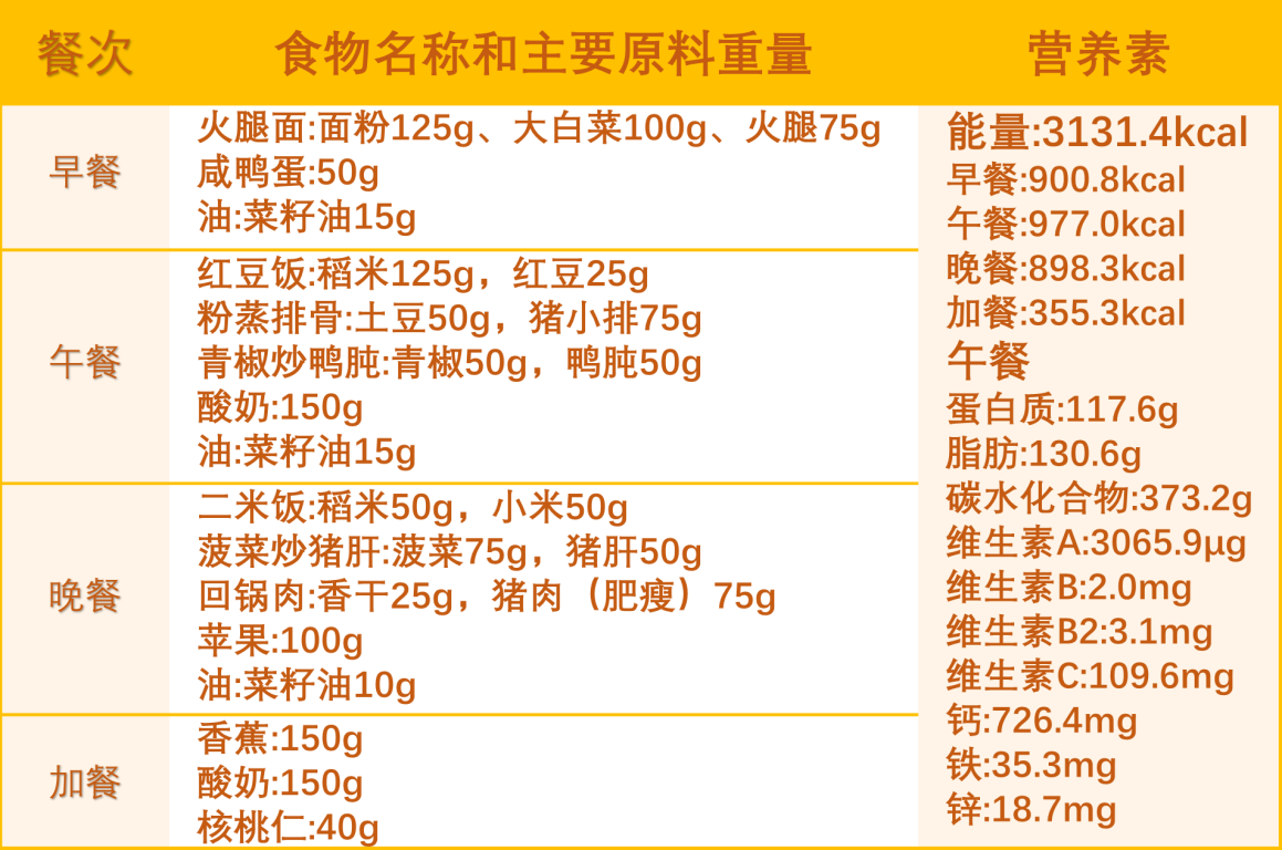 (中等体力劳动男性低温作业者一日食谱举例)