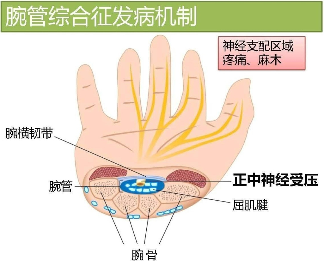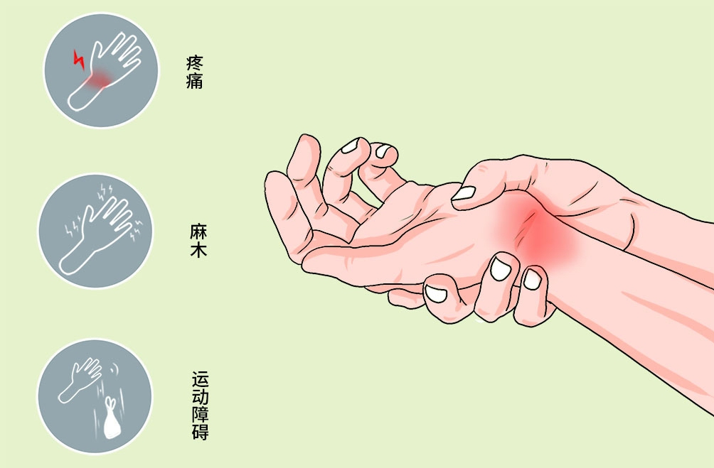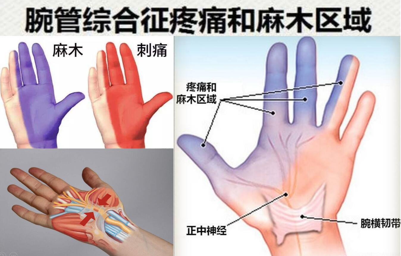 鼠标手即腕管综合征,是正中神经在腕管内遭到挤压而引起的一种周围神经卡压综合征,主要表现为腕前部疼痛及手部麻木无力,常见于正中神经分布的拇指、食指、中指等区域。
