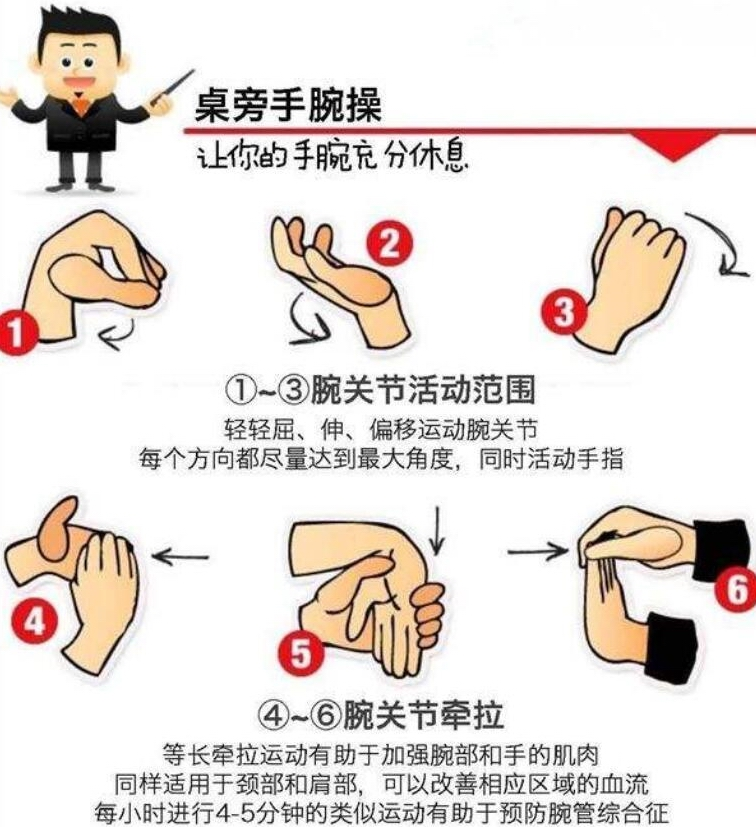 4.工作1小时左右可停下来,活动手腕,适度甩手,做手指操,促进手部血液循环;
