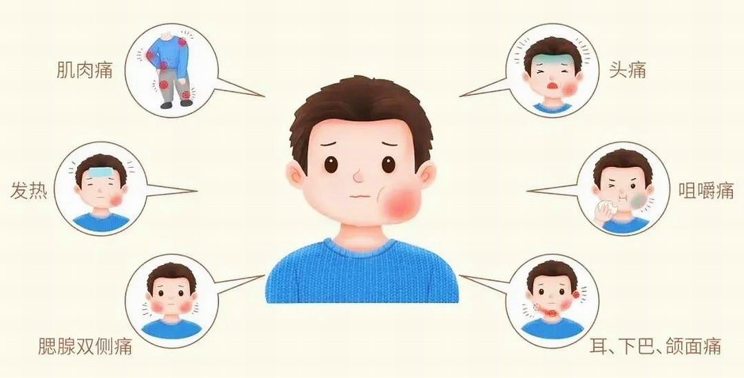 流行性腮腺炎由腮腺炎病毒引起,通过空气飞沫传播,症状包括腮腺肿胀、疼痛等,有时还可能影响其他腺体。患病初期可有发热、头痛、无力、食欲不振等症状,发病1日后出现颧骨弓或耳部疼痛,然后出现唾液腺肿大,通常可见一侧或双侧腮腺肿大。
