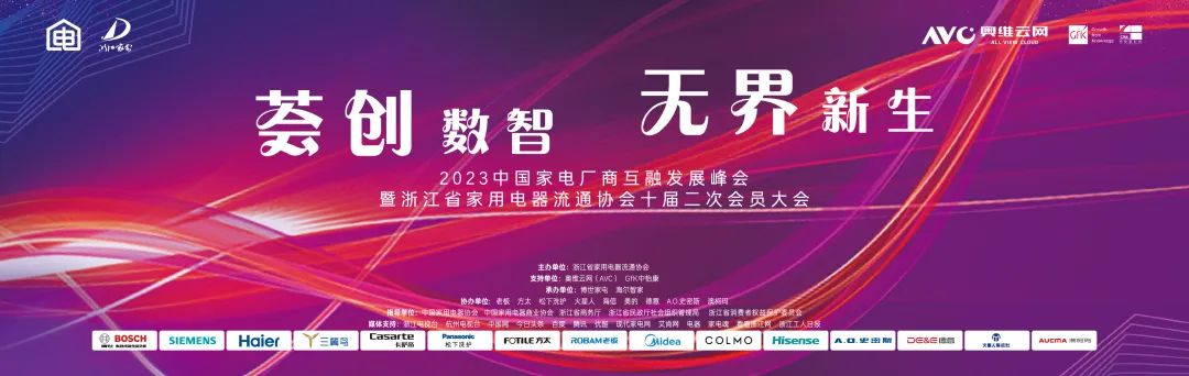 作为浙江省乃至全国家电行业2023年岁末的一大盛事,大会由浙江省家用电器流通协会主办,博世家电和海尔智家承办,获得了中国家用电器协会、中国家用电器商业协会、浙江省商务厅、浙江省社会组织管理局以及浙江省消费者权益保护委员会的指导。同时,得到了老板、方太、松下洗护、火星人、海信、美的、德意、A.O.史密斯、澳柯玛等多家国内外知名家电厂商大力支持和协助。