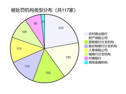 从被处罚机构类型看,涵盖银行、保险及其他金融机构共117家。其中银行业机构68家,保险业机构43家,其他金融机构6家。农村商业银行、财产保险公司等在处罚案例中较为集中,成为年度监管重点关注对象。