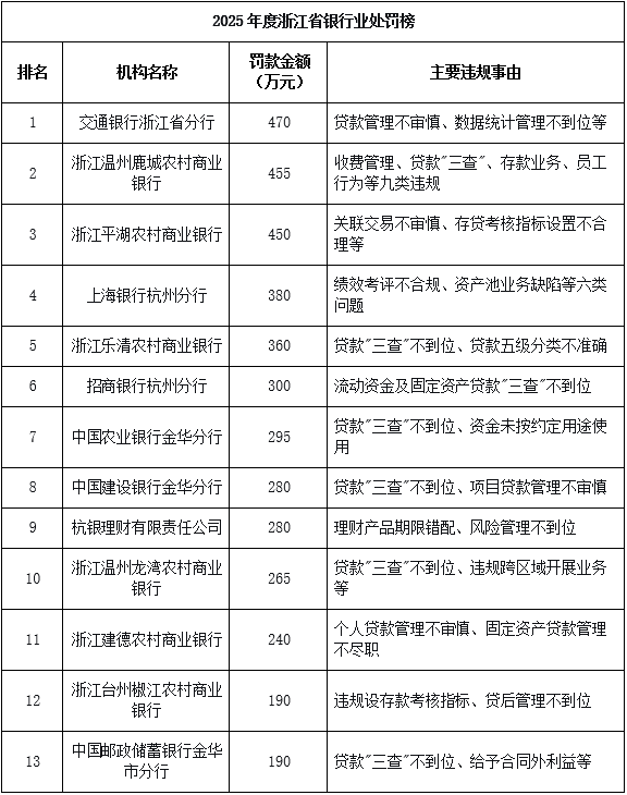 在银行业处罚中,信贷管理相关问题尤为突出。交通银行浙江省分行以470万元罚款位居榜首,主要涉及贷款管理不审慎等问题。浙江温州鹿城农村商业银行、浙江平湖农村商业银行分别以455万元、450万元罚金位列二、三位。从违规事由看,贷款“三查”不到位、存贷考核指标设置不合理、员工行为管理薄弱等成为常见问题。